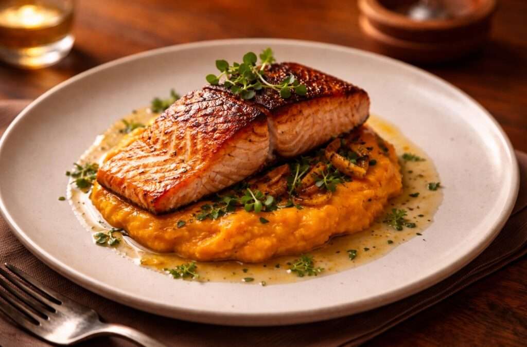 Ropogósra sült lazac, selymes édesburgonya-püré és ellenállhatatlan ízharmónia egy tányéron. Gyors, egészséges és elegáns fogás, amit garantáltan újra elkészítesz.