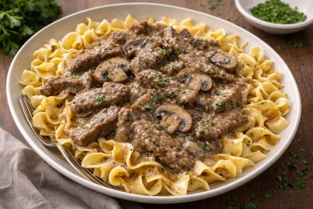 Puha marhahús, selymes gombás-tejfölös szósz és tojásos tészta – egy igazi komfortétel, ami hétköznap is ünnepivé teszi a vacsorát.