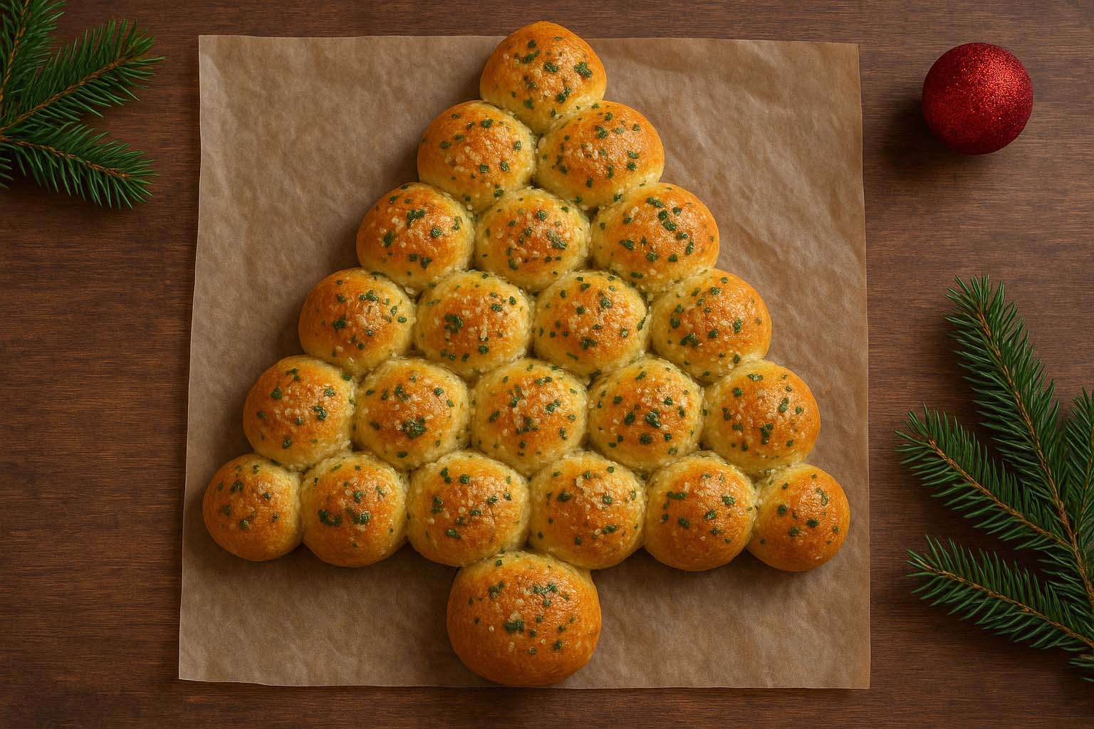 A fenyőfa alakú kenyér 20–25 perc alatt gyönyörű aranybarna lesz. Amikor a sajt megpirul, és a tészta kellemesen ruganyos, már készen is van.